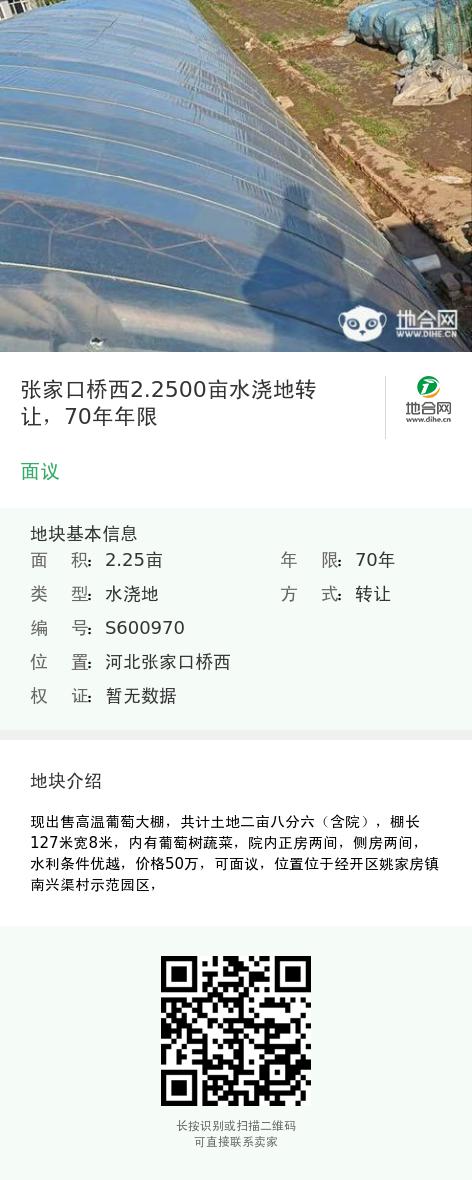 张家口桥西2.2500亩水浇地转让,70年年限